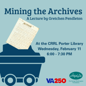 Mining the Archives: Primary Documents on Kenmore, Ferry Farm, and the Washington-Lewis Family Before the Revolution, a FREE lecture at the Porter Branch of the CRRL, by Gretchen Goodell Pendleton of The George Washington Foundation.