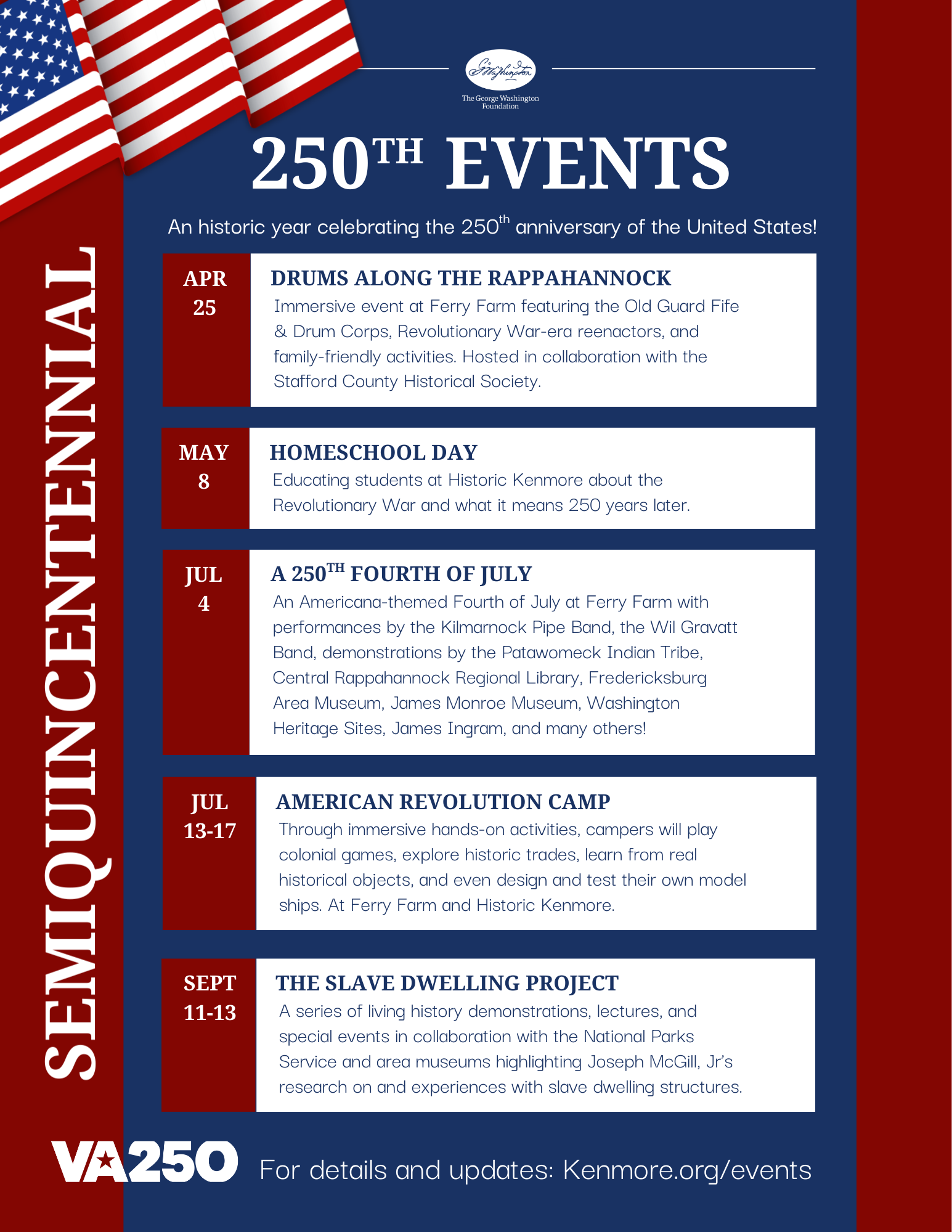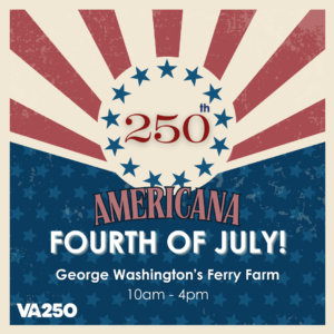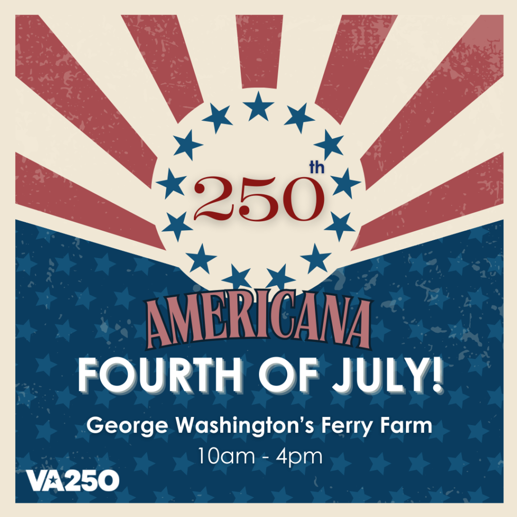 Be part of America’s 250th birthday on July 4, 2026, at George Washington’s Ferry Farm! This family-friendly Americana-themed Independence Day event commemorates the 250th anniversary of the signing of the Declaration of Independence and the birth of our nation in a setting rich with Revolutionary history. Join us for a day filled with games, hands-on activities, crafts, living history demonstrations, reenactors, and engaging programs presented by community organizations from across the region. Fabulous Fourth offers a meaningful and memorable way to honor our shared heritage and the enduring spirit of independence.