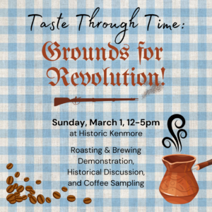 Ever wonder why coffee is so ingrained into American culture? Visit Kenmore’s historic kitchen to learn more about this revolutionary brew. Set beside the hearth fire, guests will experience the sights, sounds, and aromas of coffee as beans are toasted and brewed in a traditional pot. This cooking demonstration explores how coffee moved from a global commodity to a familiar presence in American life, fueling daily routines and revolutionary-era actions alike. The program concludes with coffee samples for guests to enjoy.